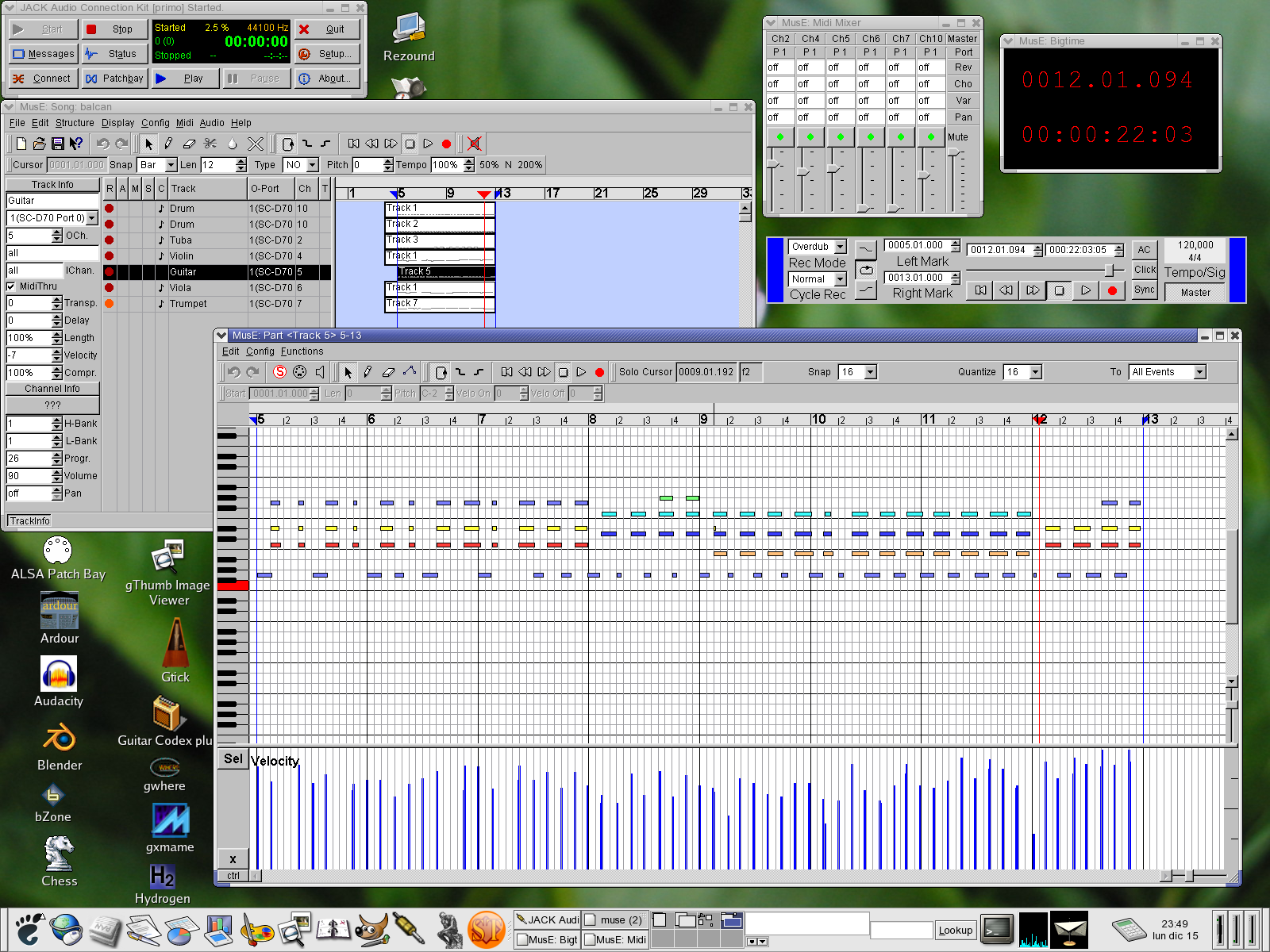 MusE is a midi and audio sequencer for Linux. MusE supports, among other things, LADSPA, Jack and ALSA, internal softsynths and many midi editors. (see Features page for more information).